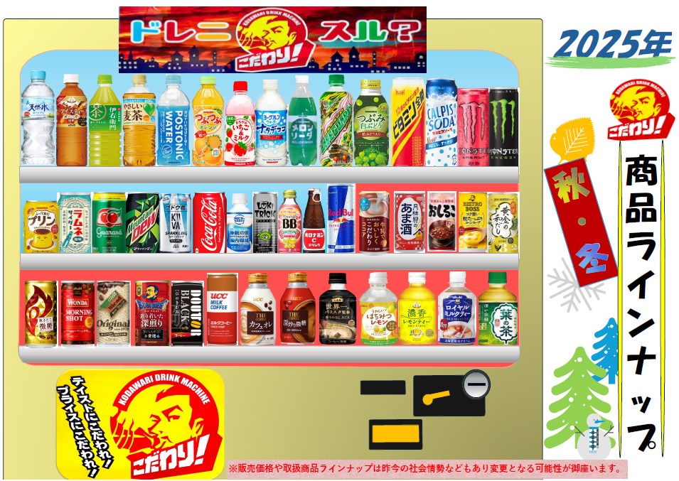 2025.10.3 アークル”こだわり自販機”2025秋・冬商品ラインナップ! アークルのオリジナル自販機、「こだわり自販機」の2025年秋冬商品のラインナップが 出そろいました! HOT商品からペットボトル商品、おいしい商品が多種そろいました! 乞うご期待! Tweet Share Hatena Pocket RSS feedly Pin it エナジードリンク専用自販機を設置しました! 前の記事